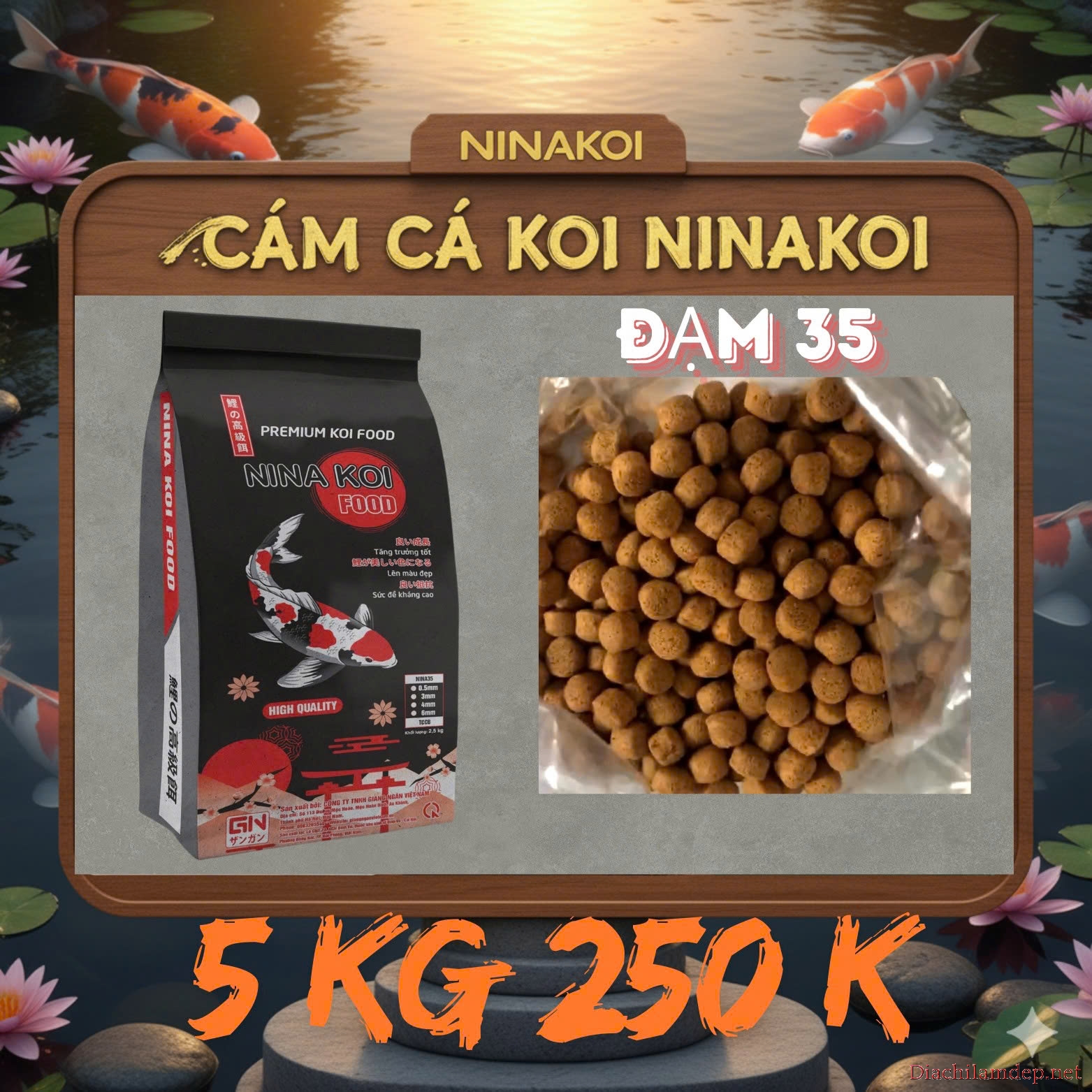 CÁM NINAKOI: KHI THỨC ĂN KHÔNG CHỈ LÀ THỨC ĂN, MÀ LÀ MỘT LỜI HỨA! Cám cá Koi Ninakoi cam kết mang lại hiệu quả vượt trội, giúp đàn cá của bạn không chỉ khỏe mạnh mà còn đạt được vẻ đẹp đỉnh cao. Mỗi bao bì sản phẩm là lời hứa về chất lượng: Lớn nhanh, tăng size: Từ cá size nhỏ đến size lớn, chỉ cần cho ăn đúng cách, bạn sẽ thấy sự khác biệt. Lên màu xuất sắc: Các mảng màu Hi, Ki, Kohaku,... sẽ trở nên đậm nét, rực rỡ hơn bao giờ hết. Hệ tiêu hóa khỏe: Giúp cá hấp thu tốt, tránh được các bệnh đường ruột nguy hiểm. Giữ nước hồ trong vắt: Không còn nỗi lo nước đục, váng dầu sau mỗi lần cho ăn. Hãy để Ninakoi đồng hành cùng bạn trên hành trình chinh phục vẻ đẹp của "quốc ngư".
